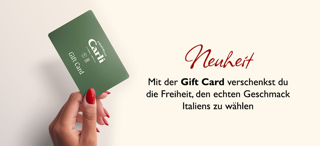 Mit der GIFT CARD FRATELLI CARLI verschenkst du die Freiheit, aus vielen authentischen Spezialitäten zu wählen. Digital, sofort verfügbar und personalisierbar: das ideale Geschenk, um deinen Liebsten eine Freude zu machen. So wird jede Aufmerksamkeit zu einem besonderen Moment voller Genuss, Authentizität und Einfachheit.