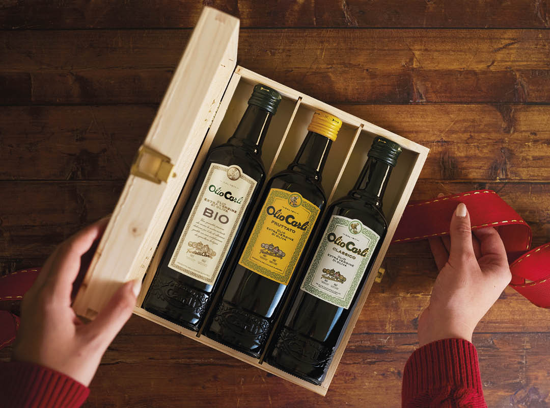 Die Olio Carli Geschenkbox ist ein Geschenk voller Sorgfalt, Geschmack und Alltagskultur. Ideal zum Teilen in der Festzeit – oder als Vorrat für besondere Rezepte. Sie schenkt dir jeden Tag die Freiheit, das passende Olivenöl zu wählen: zart für einfache Gerichte, intensiv zum Verfeinern kräftiger Aromen.