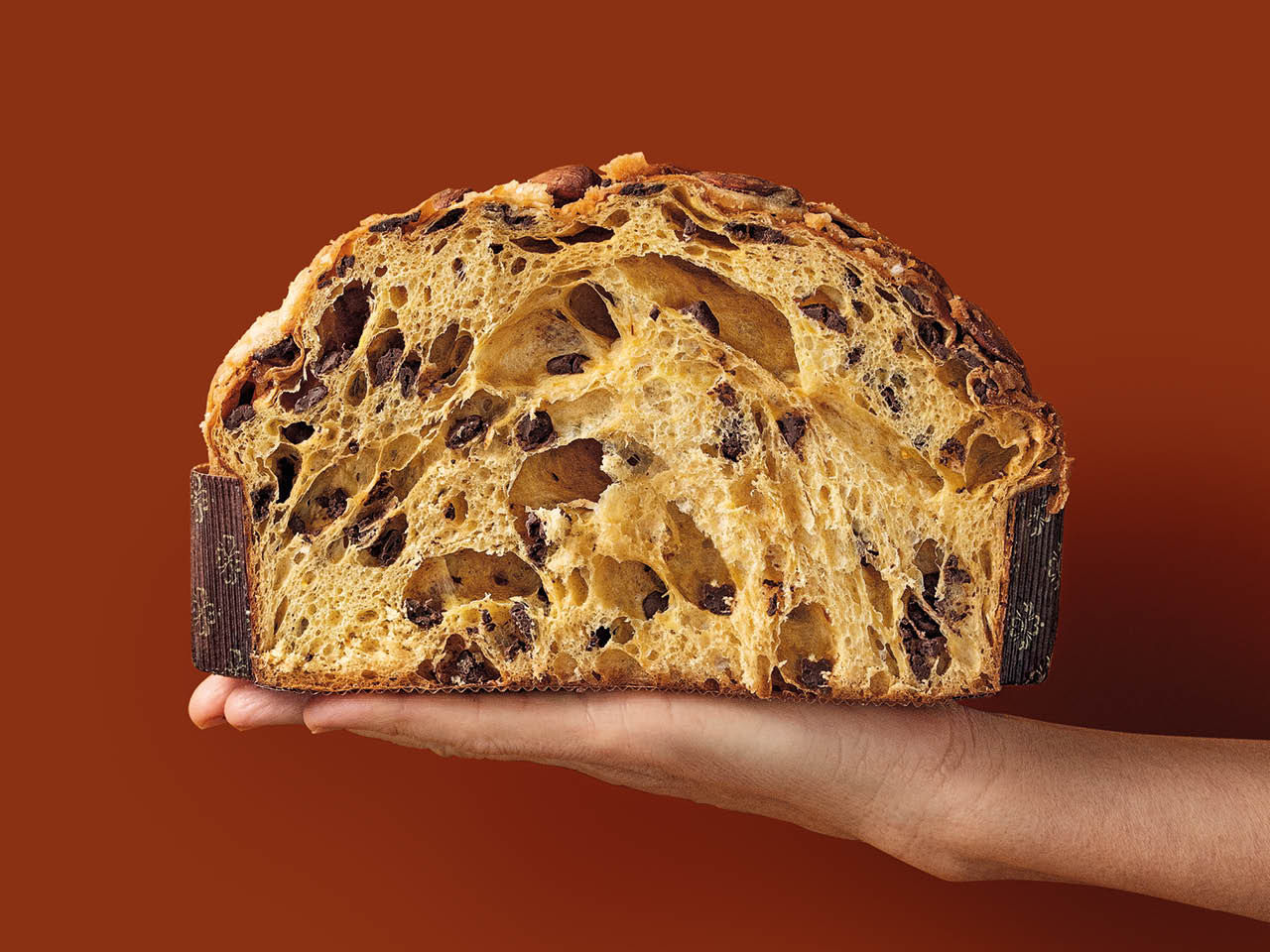 Zutaten: Weizenmehl, Schokoladenstückchen 17% (Zucker, Kakaomasse, Kakaobutter, Kakaomasse, Emulgatoren: Lecithine (Sonnenblumen- und Raps-Lecithine), natürliches Vanilleextrakt), frischer Eidotter von Hühnern aus Freilandhaltung, Wasser, natives Olivenöl extra 7%, Rohrzucker, natürlicher Sauerteig (Weizenmehl, Wasser), kandierte und gemahlene Orangenpaste (Orangenschale, Glukosesirup, Zucker), Zucker, Eiweiß, Puderzucker, Honig, Mandeln 2%, Zuckerstreusel, Reismehl, Olivenöl, Emulgatoren: Mono- und Diglyceride von Speisefettsäuren, Salz, Aromen.
