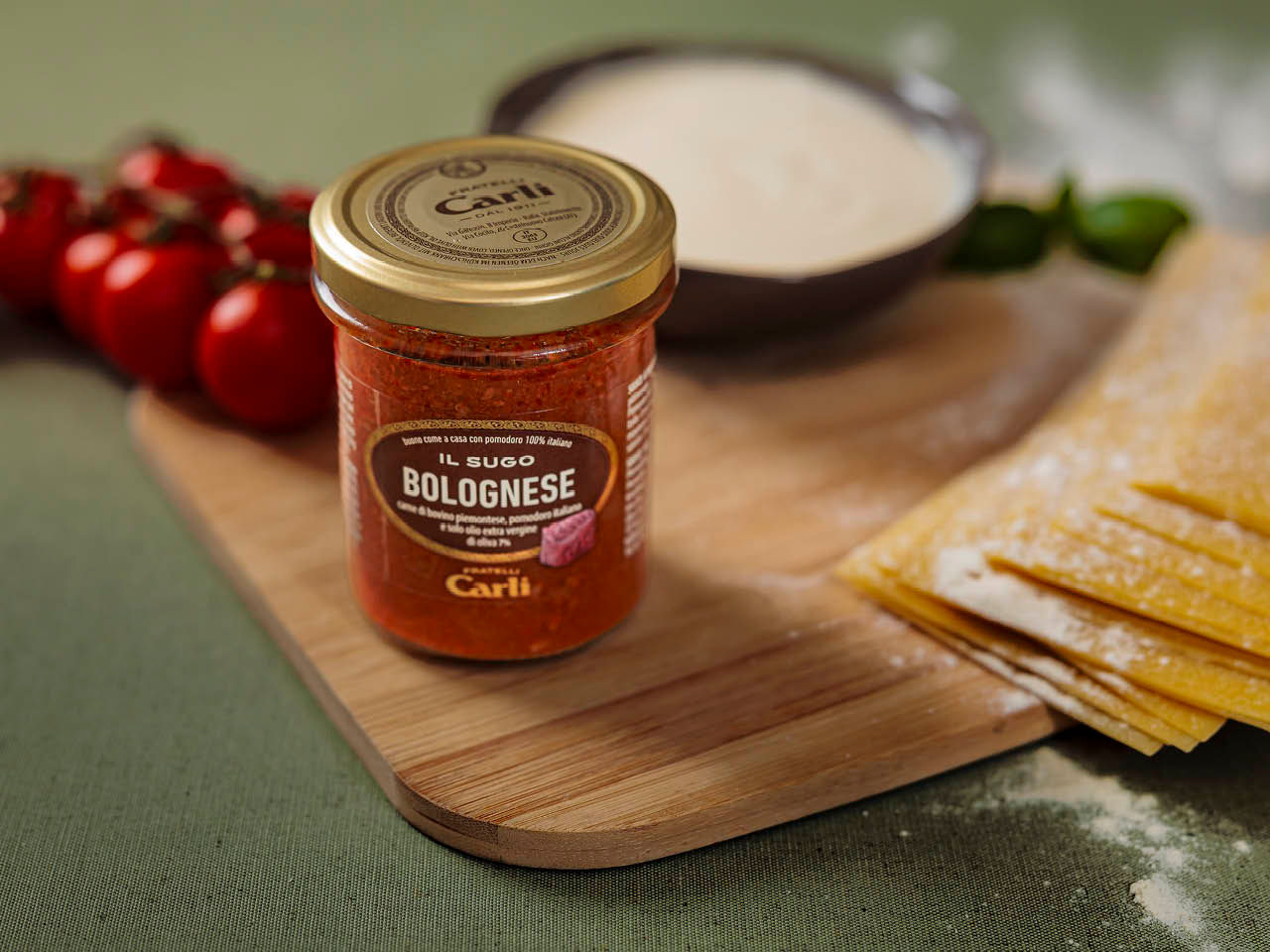 Tomate 40%, boeuf 35%, huile d'olive extra vierge 7%, oignons, carottes, vin rouge DOC Piemonte Barbera 3%, sucre, sel, herbes aromatiques, ail.